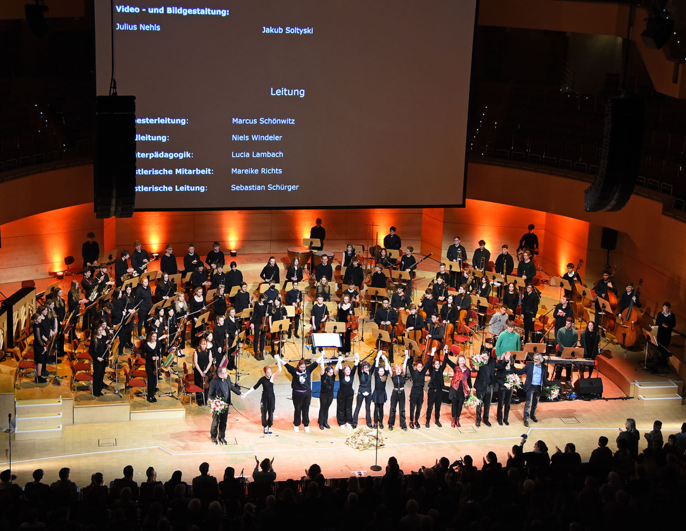 „Aufstand des Gewissens“, mit diesem Titel fand am 19. Januar 2023 in der Philharmonie Essen ein Kompositionsprojekt der Philharmonie mit Schülerinnen und Schülern der Goetheschule Essen und der Realschule Essen-Überruhr statt. Unter der Gesamtleitung von Sebastian Schürger hatten sich beide Schülergruppen monatelang vorbereitet und sich mit dem Kunstbegriff auseinandergesetzt. Seitens der Goetheschule hatte Dr. Marcus Schönwitz nicht nur die Orchesterleitung, sondern organisierte auch die Teilnahme der gesamte Schüler- und Lehrerschaft. Auf diese Weise wurde das Musikprojekt zu einem echten Gemeinschaftserlebnis.