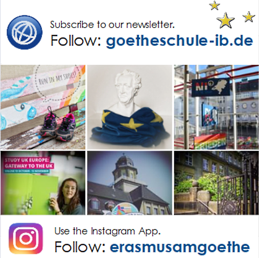 Auch in Corona-Zeiten läuft die Kooperation mit unseren Partnerschulen in Dänemark, Schweden, den Niederlanden, Italien, Litauen, Polen, Spanien und Zypern weiter. Vieles findet allerdings gerade online statt, also hinter den Kulissen. Um einen Eindruck davon zu bekommen, welche Projekte auch auf Distanz aktuell durchgeführt werden, mit Euch zu teilen, was wir für die nahe Zukunft planen und auch einfach um ein bisschen gute Laune zu verbreiten, haben wir unter erasmusamgoethe einen Instagram-Feed eingerichtet. Wer in der Instagram-Gruppe mitmachen möchte, ist herzlich willkommen. Wir freuen uns über Ideen, Fotos und kleine Filme.