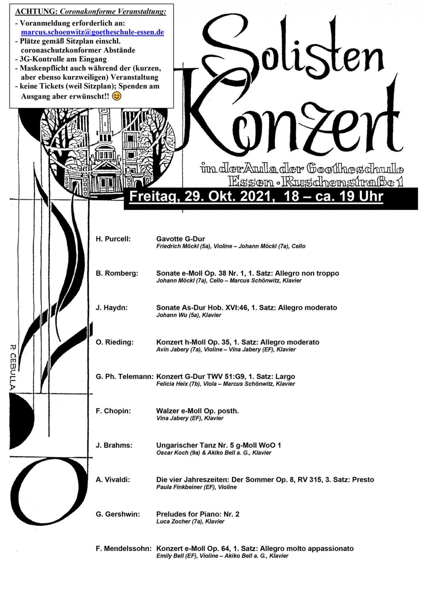 Am Freitag, den 29.10.2021, wird in der Goetheschule Essen-Bredeney seit langem mal wieder ein Solistenkonzert auch für die Öffentlichkeit gegeben.