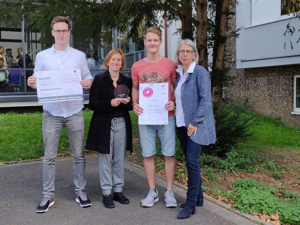 Am 11. September haben Marc (jetzige Q2) und Jonathan (ehemalige Q2) in feierlichem Rahmen den Sonderpreises der GFOS-Innovationsawards erhalten. Das Essener Softwareunternehmen GFOS richtet jedes Jahr einen Wettbewerb für Oberstufenschüler/innen in den Bereichen Informatik und Marketing aus. Marc und Jonathan beschäftigten sich, betreut von Frau Gwisdalla, in ihrem Beitrag mit dem Thema "Social Media Recruiting", das bedeutet Mitarbeitergewinnung durch Werbung und direkte Ansprache in sozialen Medien wie Facebook und Instagram. Herzlichen Glückwunsch!