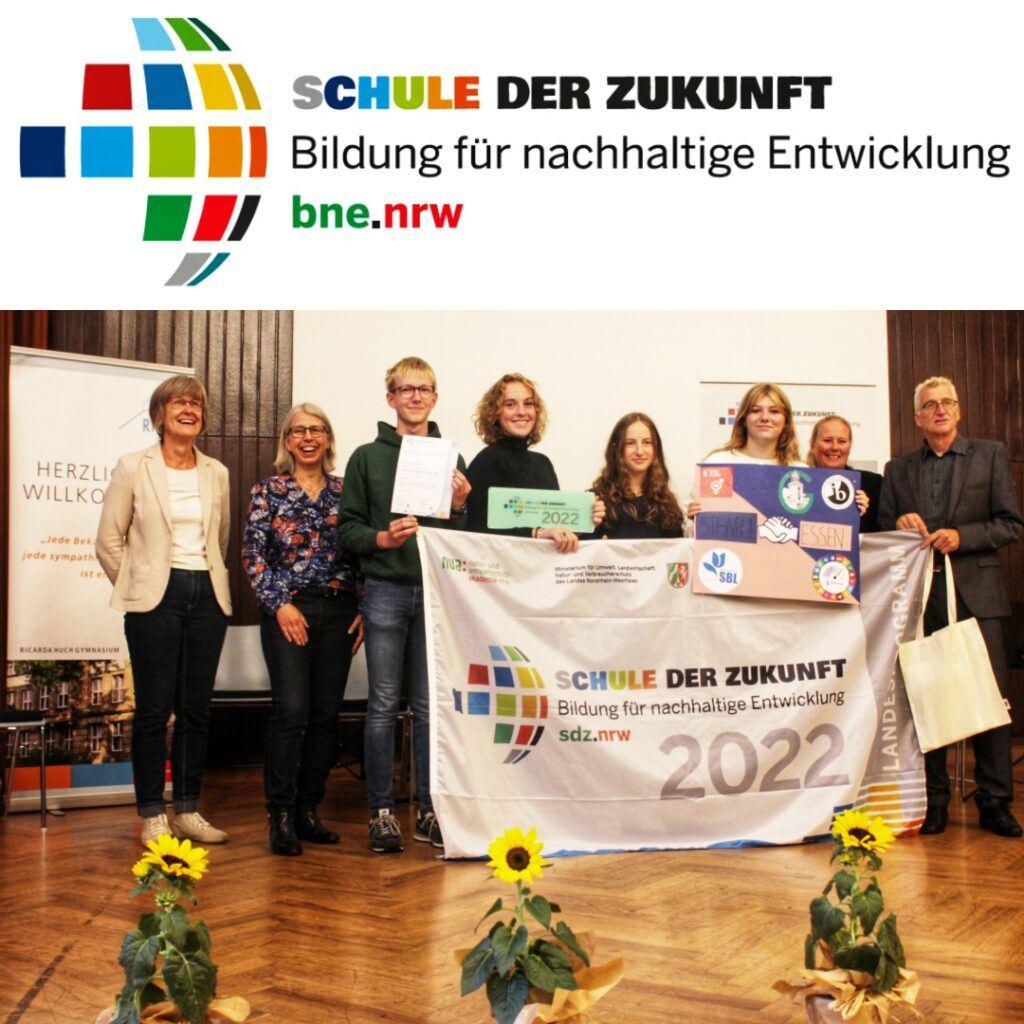 Um die Wette gestrahlt wurde am Dienstag, dem 14. September 2022, als die Goetheschule Essen in Krefeld offiziell als “Schule der Zukunft” ausgezeichnet wurde. Insgesamt 17 Schulen aus dem Regierungsbezirk Düsseldorf wurden von Marlies Dieckmann vom Umweltministerium (links), der Krefelder Bürgermeisterin Kerstin Jensen (Zweite von rechts) und Landeskoordinator Wulf Bödeker (rechts) im Rahmen des Schulprogramms “Globales Lernen und Bildung für nachhaltige Entwicklung” für ihre herausragende, zukunftsorientierte Bildungsarbeit gewürdigt.