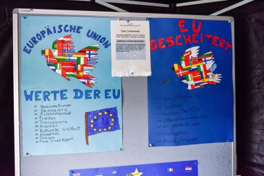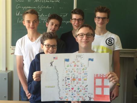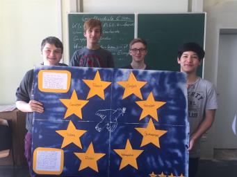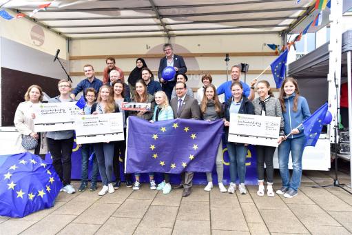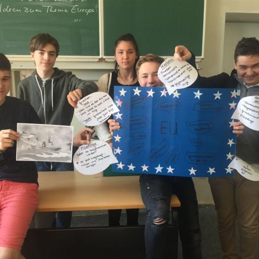 Die drei Klassen der Jahrgangsstufe 9 haben mit ihren im Politikunterricht von Frau Gwisdalla und Frau Mesterheide erstellten Beiträgen überaus erfolgreich am Wettbewerb der Stadt Essen teilgenommen. Zum Thema „Ey yoU – Was ist deine Meinung zur EU?“ wurden fleißig Plakate erstellt, Skulpturen angefertigt, Filme gedreht, Websites eingerichtet und Songs vertont. Diese Kreativität wurde auch in den Platzierungen deutlich, so konnten die Plätze 1- 7 und der 10. Platz belegt werden! Herzlichen Glückwunsch! Neben zahlreichen Geldpreisen wurde so auch eine Klassenreise nach Brüssel errungen, die die Schülerinnen und Schüler der Klasse 9a in der Jahrgangsstufe 10 antreten werden. Die feierliche Preisverleihung durch unseren Oberbürgermeister Thomas Kufen fand am 02.07. 2017 während der Veranstaltung der Initiative „Pulse of Europe“ auf dem Platz vor der Philharmonie Essen statt.