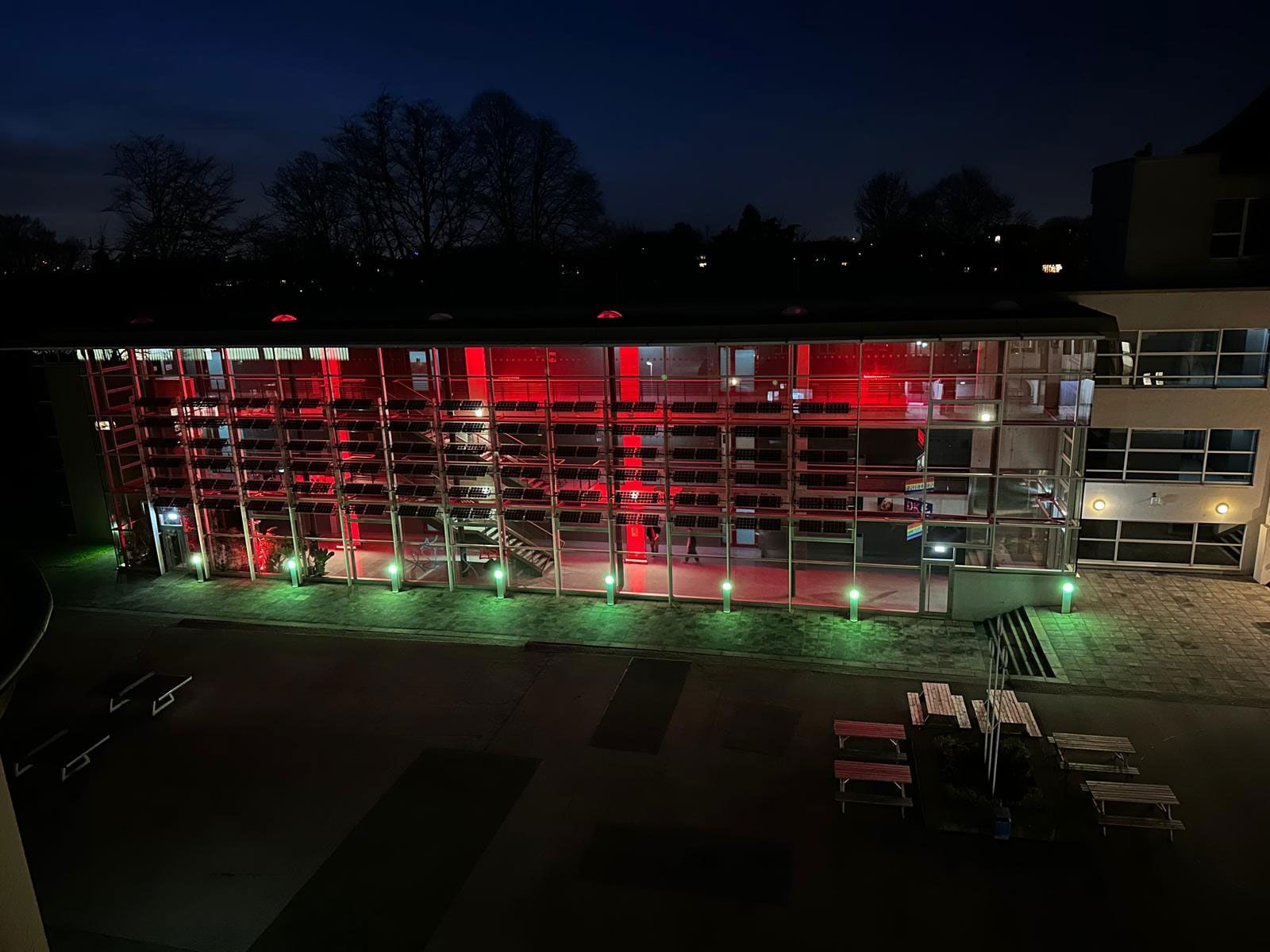 Ein zusätzliches Highlight - im wahrsten Sinne des Wortes - wurde durch unsere Technik-AG herbei gezaubert: Die Schule erstrahlte an vielen Stellen in faszinierenden Lichtern und Geister erschienen wie von Zauberhand.