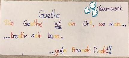 Meine ersten Tage auf der Goethe waren sehr spannend. Bei der Einschulung haben uns die Unterstufenkoordinatorin und die Schuldirektoren willkommen geheißen und natürlich auch unsere Klassenlehrer. Danach haben uns unsere Lehrer in unsere Klassen geführt. Dort habe ich meine Klasse kennen gelernt. Nach 2 Stunden war unser erster Tag auf der Goethe zu Ende und unsere Eltern haben uns abgeholt. Am nächsten Tag begann der richtige Unterricht mit tollen Fächern. Die neuen Fächer machen mir viel Spaß. In der ersten Sportunterrichtstunde haben wir etwas über Teamarbeit mit einem tollen Spiel gelernt. In Biologie haben wir auch schon mit Mikroskopen gearbeitet, das hat mir richtig viel Spaß gemacht. Außerdem gibt es ein tolles Bistro mit leckerem Essen. Ich bin auch noch im Chor, wo wir schon echt schöne Weihnachtslieder singen und am Ende des Jahres vor den Eltern auftreten. Mir gefällt der Chor ziemlich gut. Außerdem gibt es auch viele tolle AGs. Ich bin auch in der Zirkus-Ag, dort macht es mir großen Spaß.