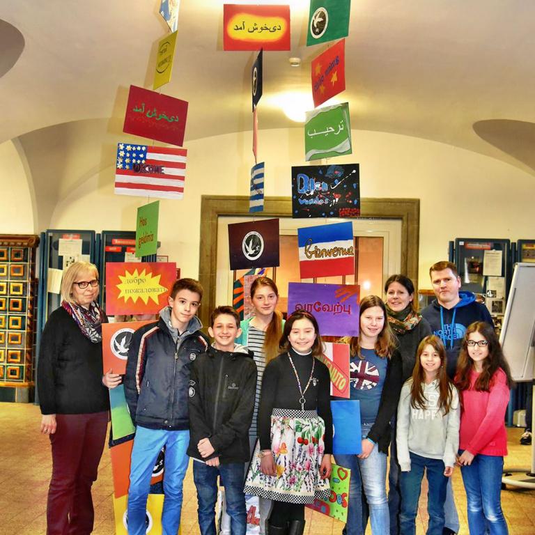 Um Besucher, Gäste und unsere Neuzugänge an der Goetheschule begrüßen zu können, haben die Schülerinnen und Schüler der Kunst- Ag ein Mobile aus Schildern entworfen, bei dem auf vielen Tafeln die Formulierung „ Herzlich Willkommen“ in verschiedenen Sprachen zu lesen ist. Dementsprechend wird man zur Zeit im Foyer der Goetheschule jeden Morgen vielfach willkommen geheißen.