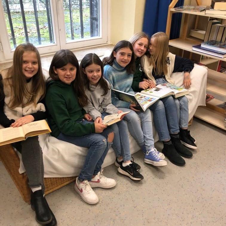 In der schülergerecht eingerichteten Schülerbücherei übernehmen Schülerinnen und Schüler als ausgebildete Bibliothekshelfer die Betreuung. Zahlreiche Sitz- und Liegeangebote bieten die Möglichkeit, sich aus der Auswahl aus vielen Büchern zu bedienen und es sich zum Lesen gemütlich zu machen.