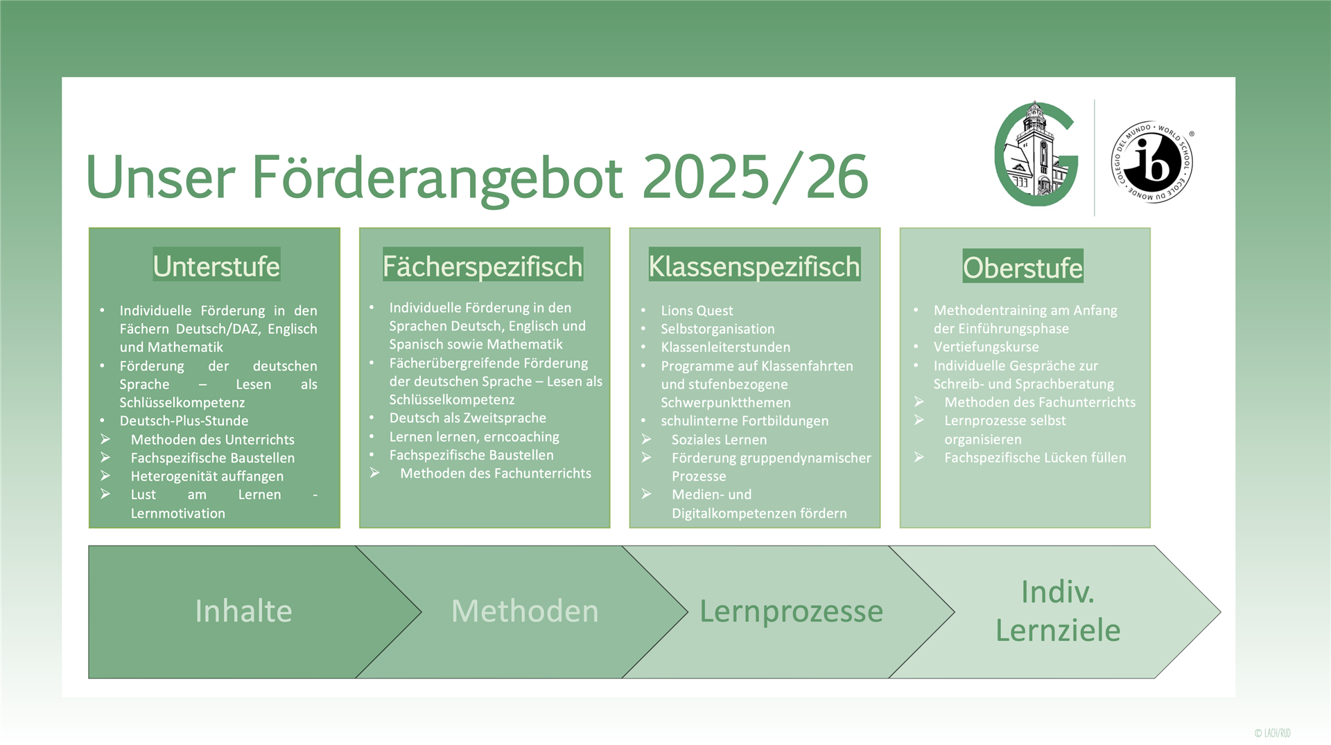 Individuelle Förderung heißt, Interessen vertiefen, aber auch Schwächen aufholen. Alle interessierten Schülerinnen und Schüler, die an den Einzelprogrammen teilnehmen wollen, melden sich persönlich bei den in dieser Übersicht aufgeführten Lehrkräften, um gemeinsame Vereinbarungen über das konkrete Förderprogramm und das Modell (z.B. Blockmodell) zu treffen.