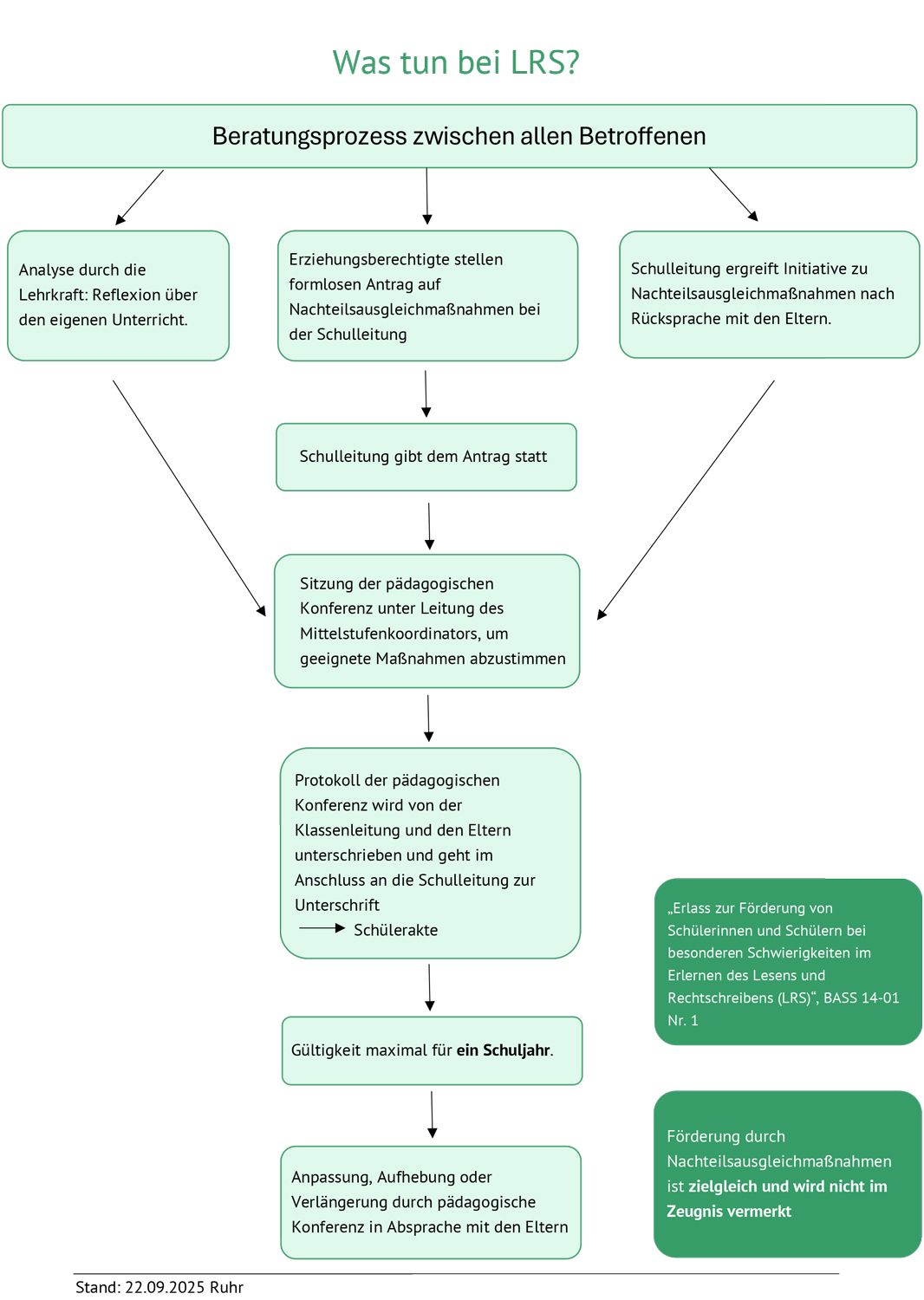 Die rechtlichen Grundlagen für den Umgang mit Lese-Rechtschreibschwierigkeiten in der Schule bilden der Erlass „Förderung von Schülerinnen und Schülern bei besonderen Schwierigkeiten im Erlernen des Lesens und Rechtschreibens (LRS)“ und die Arbeitshilfen für die verschiedenen Schulstufen. Allerdings sollte stets die Förderung der betroffenen Kinder und Jugendlichen durch das pädagogische Handeln der Lehrkräfte im Vordergrund stehen.